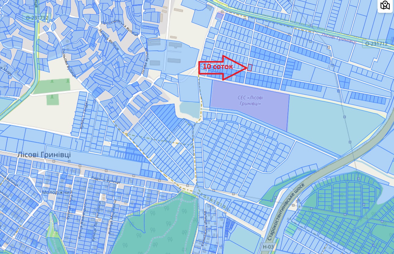 Продам землю. 10 соток. Лісові Гринівці. Виїзд на Старокостянтинівське шосе. Вартість: 800$/сотка + витрати на переоформлення. Кадастровий номер: 6825083600:03:007:0956 На загальній схемі схемі №0956 Тип власності: Приватна власність Цільове призначення: 01.03 Для ведення ОСГ. Можна перевести під індивідуальне будівництво. Поруч є ще такі ж ділянки на продаж