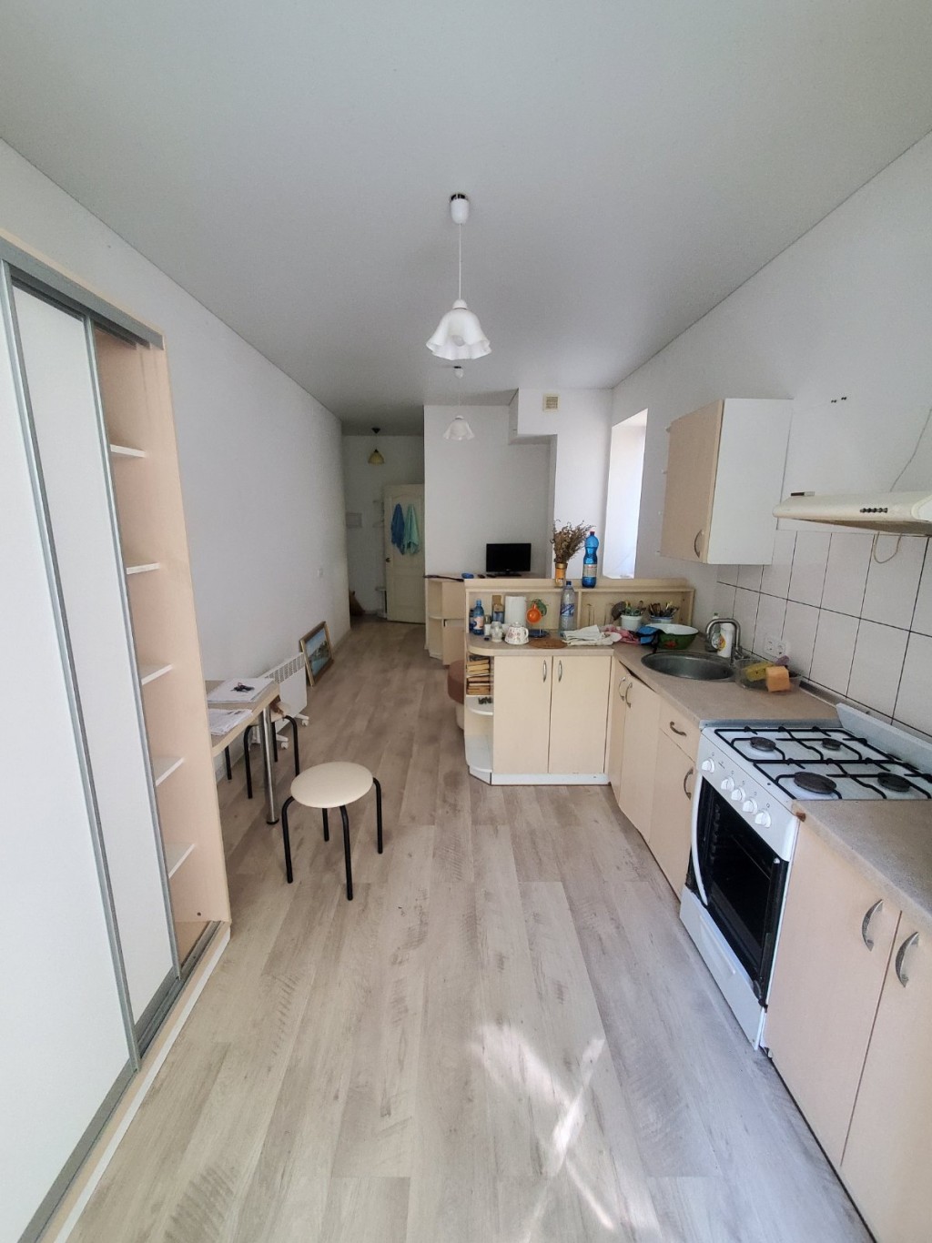 Кухня-студія з зоною спальні та окремим санвузлом. Комплектація меблів та техніки: диван розкладний, обідній стіл, шафа-купе, газова плита, холодильник, витяжка, мийка. Санвузол з ванною, пральна машина, умивальник з дзеркалом. Встановлений двоконтурний газовий котел на опалення, газовий лічильник. Велике панорамне вікно.