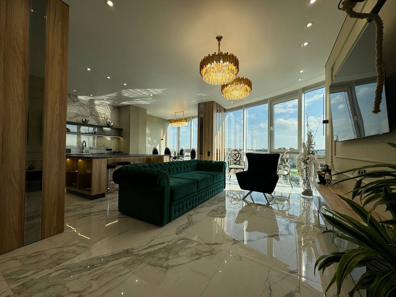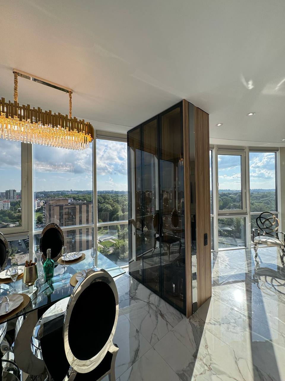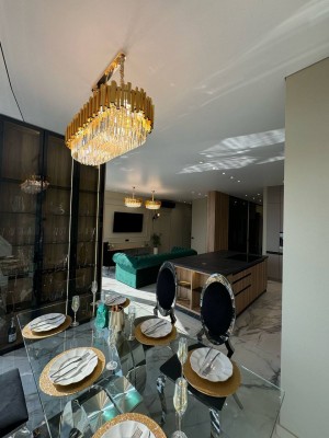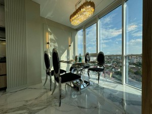 Квартира площею 107/56.7/23.7 м.кв розташована на 10/14 поверсі з неймовірними краєвидами, що відкриваються з панорамних вікон.