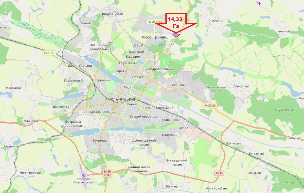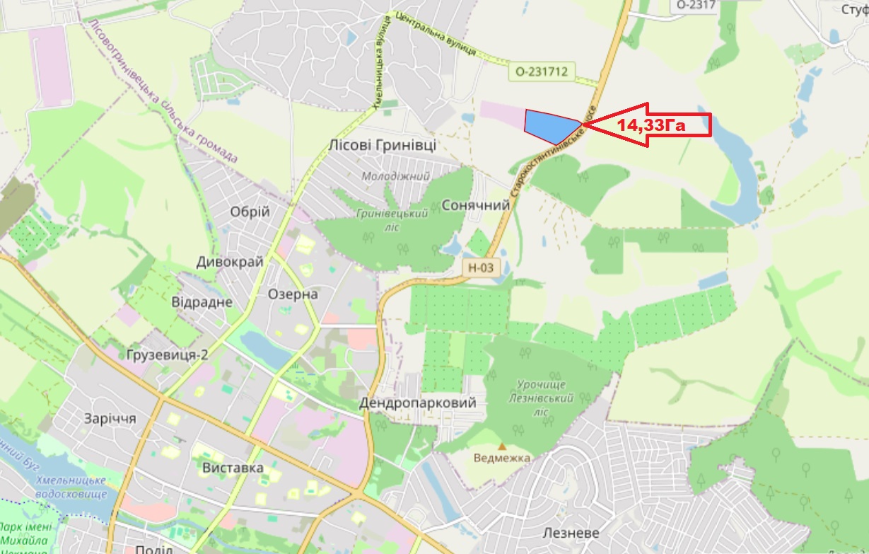 Продаж земельної ділянки 14.3288 га в передмісті Хмельницького, Лісові Гринівці. Адреса: Хмельницька область, Хмельницький район, с. Лісові Гринівці, вулиця Степана Бандери, 27/1 Розташування: знаходиться в масиві між СЕС "Лісові Гринівці"…