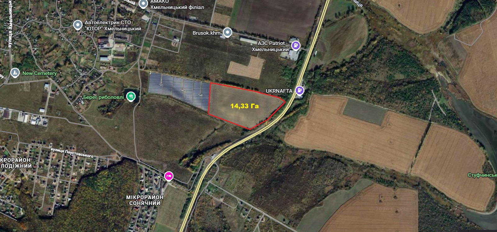 Продам велику земельну ділянку в передмісті Хмельницького, Лісові Гринівці. Площа: 14,3288 Га Вартість: 788 000$ (550$/сотка)+ витрати на переоформлення. Кад.№: 6825083600:03:007:1982 Призначення: 14.01 Для розміщення, будівництва, експлуатації та обслуговування будівель і споруд об'єктів енергогенеруючих підприємств, установ і організацій Власність: приватна. Адреса: Хмельницька область, Хмельницький район, с. Лісові Гринівці, вулиця Степана Бандери, 27/1 Розташування: знаходиться в масиві між СЕС"Лісові Гринівці" Старокостянтинівським шосе. Фасадна частина до траси - 365м.. Гарна інвестиція. Можна змінити призначення під будівництво. Пропозиція від представника власника.