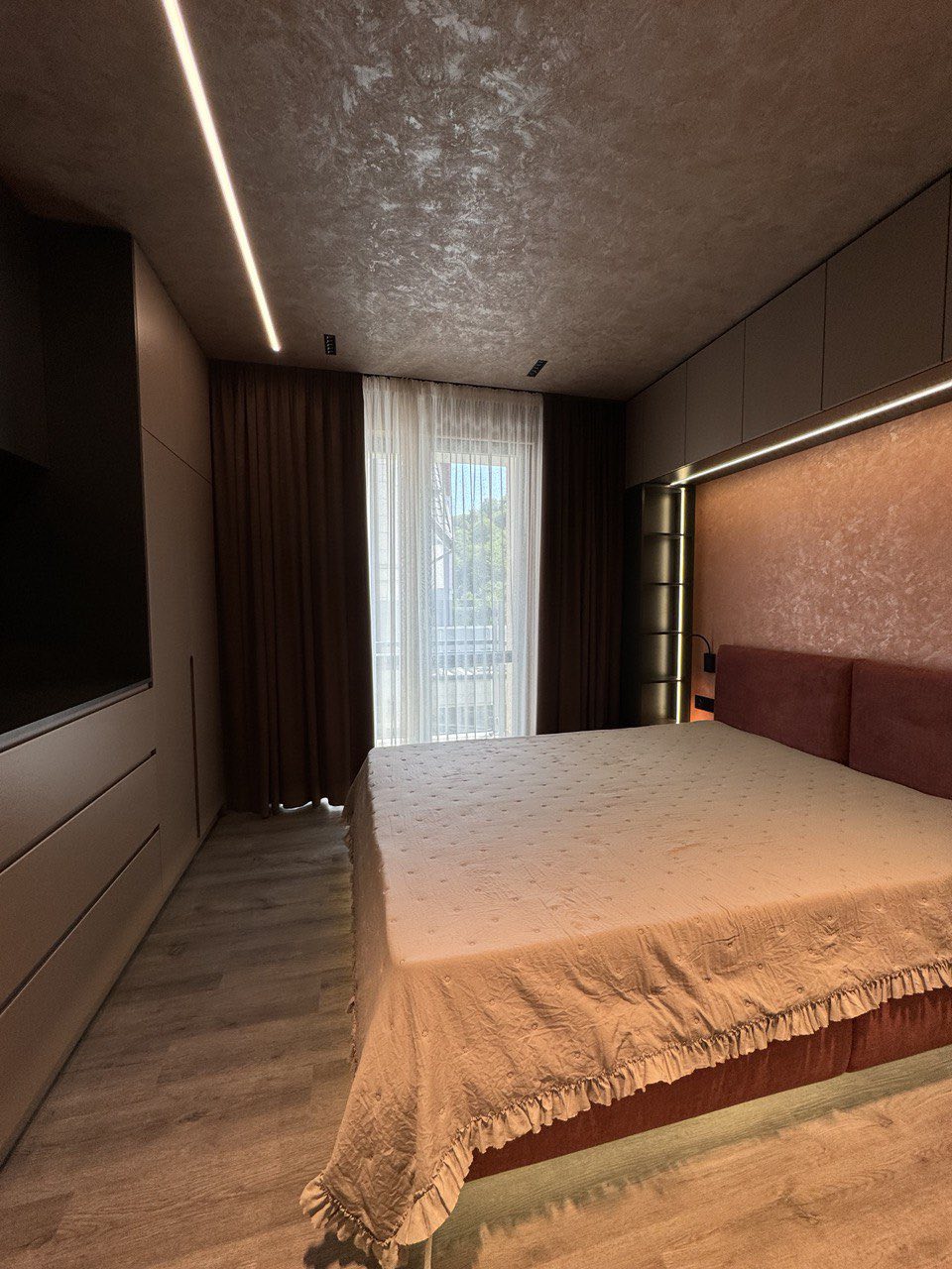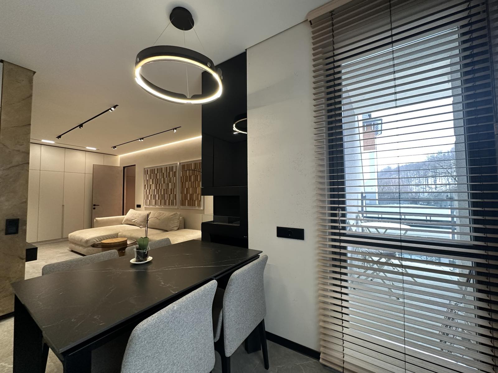 ОСНАЩЕННЯ КВАРТИРИ . всі корпусні та м’які меблі Frankoff . багато різних сценаріїв освітлення . декоративна штукатурка у всіх приміщеннях . ексклюзивна акцентна стіна під камінь, виконана вручну художниками та штукатурами . біокамін . вбудована побутова техніка . кондиціонер