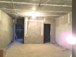 Выполнена разводка по воде и электричеству. Стены оштукатурены, пол-стяжка.