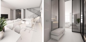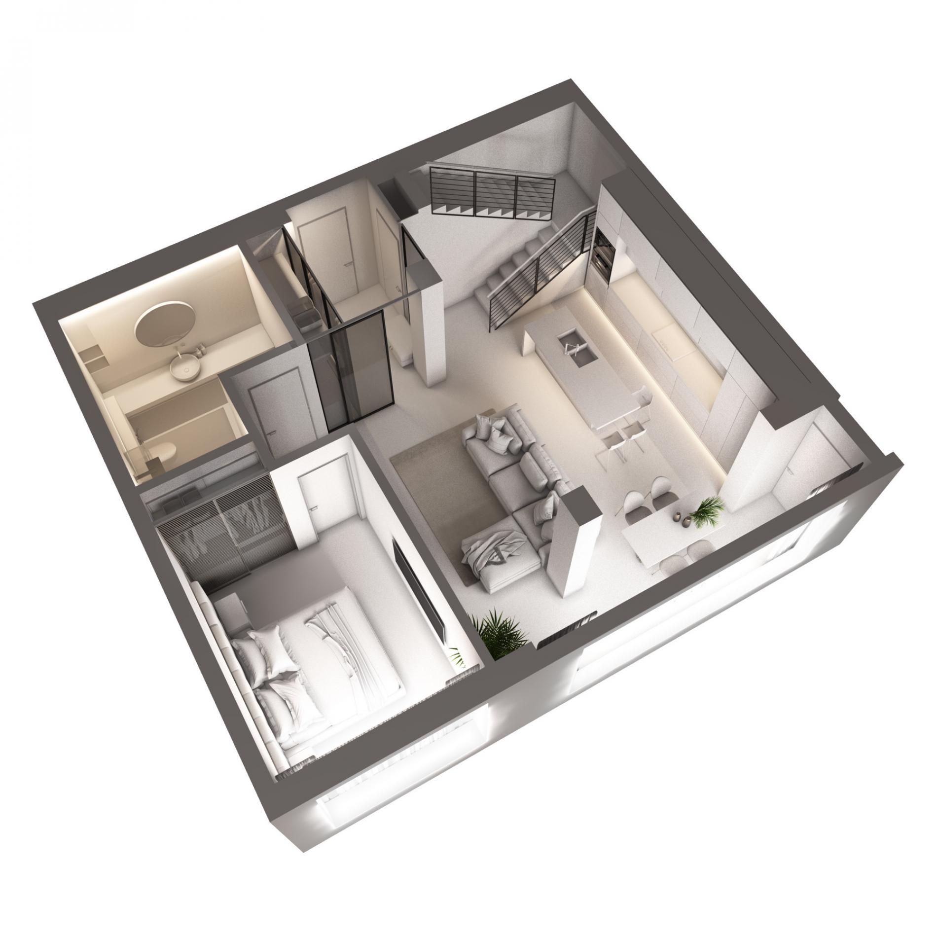1-й рівень (19-й поверх): кухня-студія – 20,85 кв.м, спальня 22,48 кв.м, санвузол 6,56 кв.м, передпокій – 16,66 кв.м, лоджія – 6 , 73 кв.м.