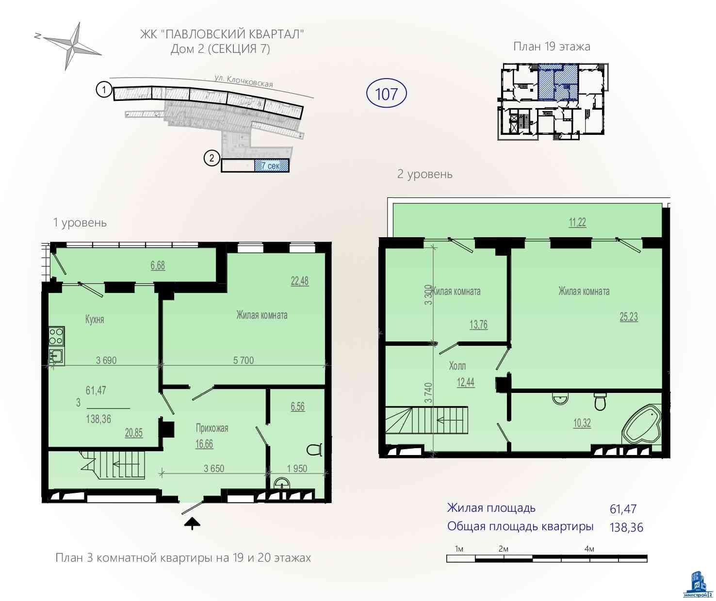 2-й рівень (20-й поверх): дві спальні – 13,76 кв.м та 25,23 кв.м, санвузол 10,32 кв.м, хол – 12,44 кв.м, тераса – 11,22 кв.м.